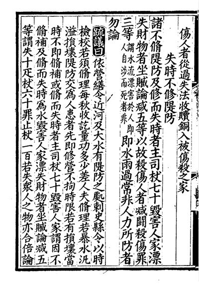 清嘉慶年間版《唐律疏議》書影,這一頁(yè)展示的是對(duì)“失時(shí)不修堤防”的懲處措施。